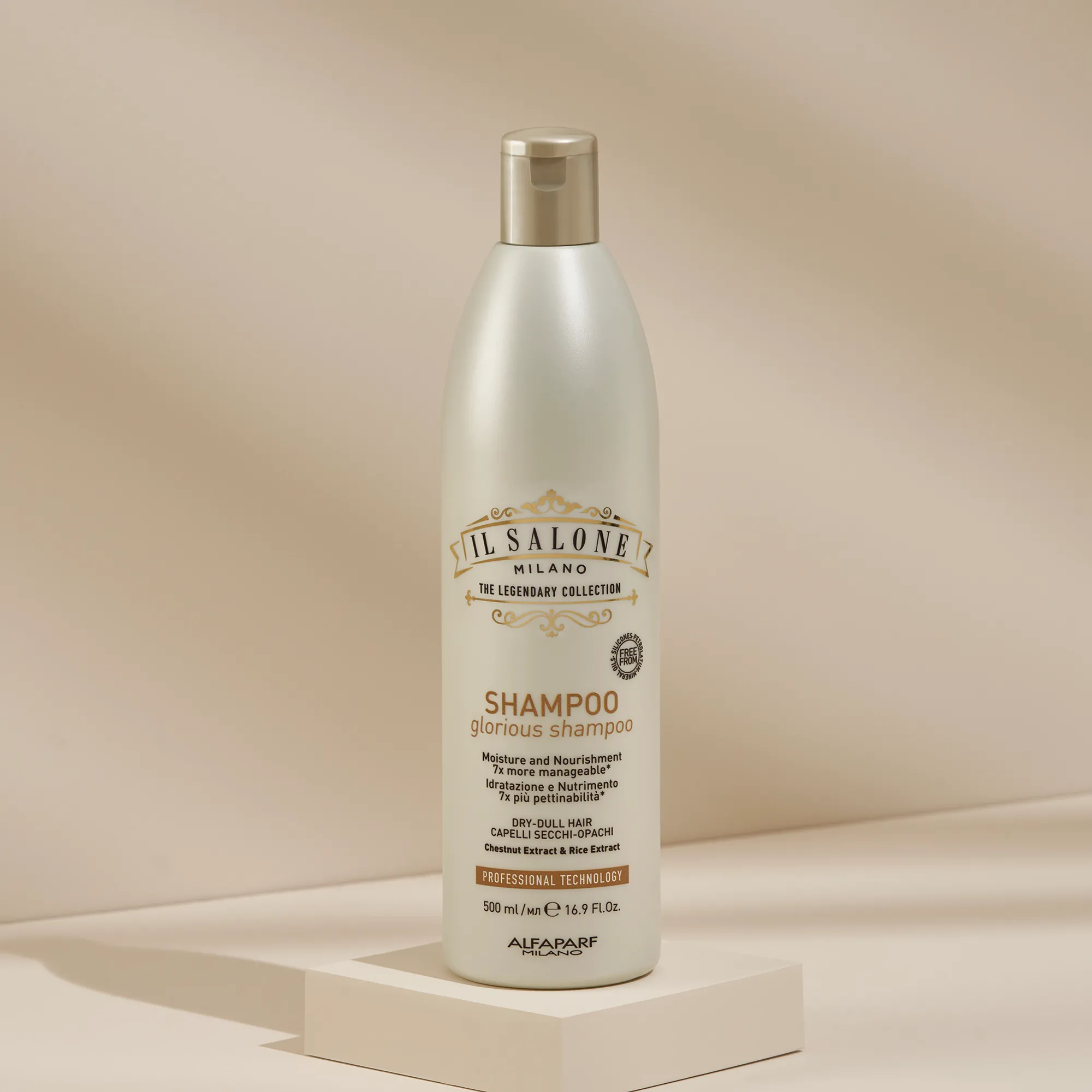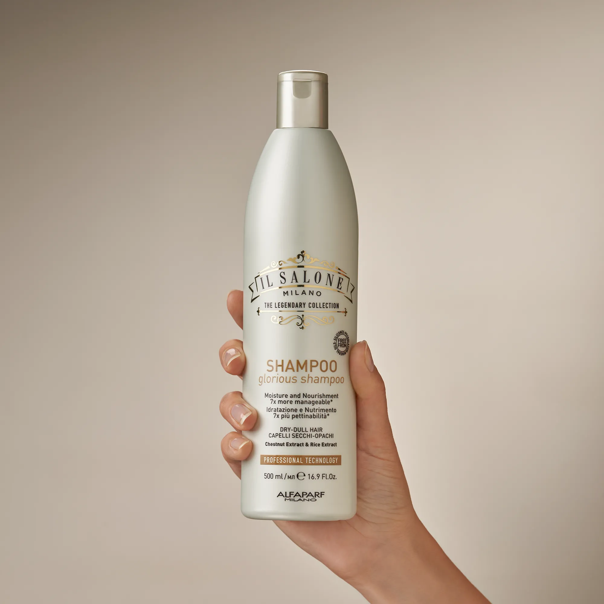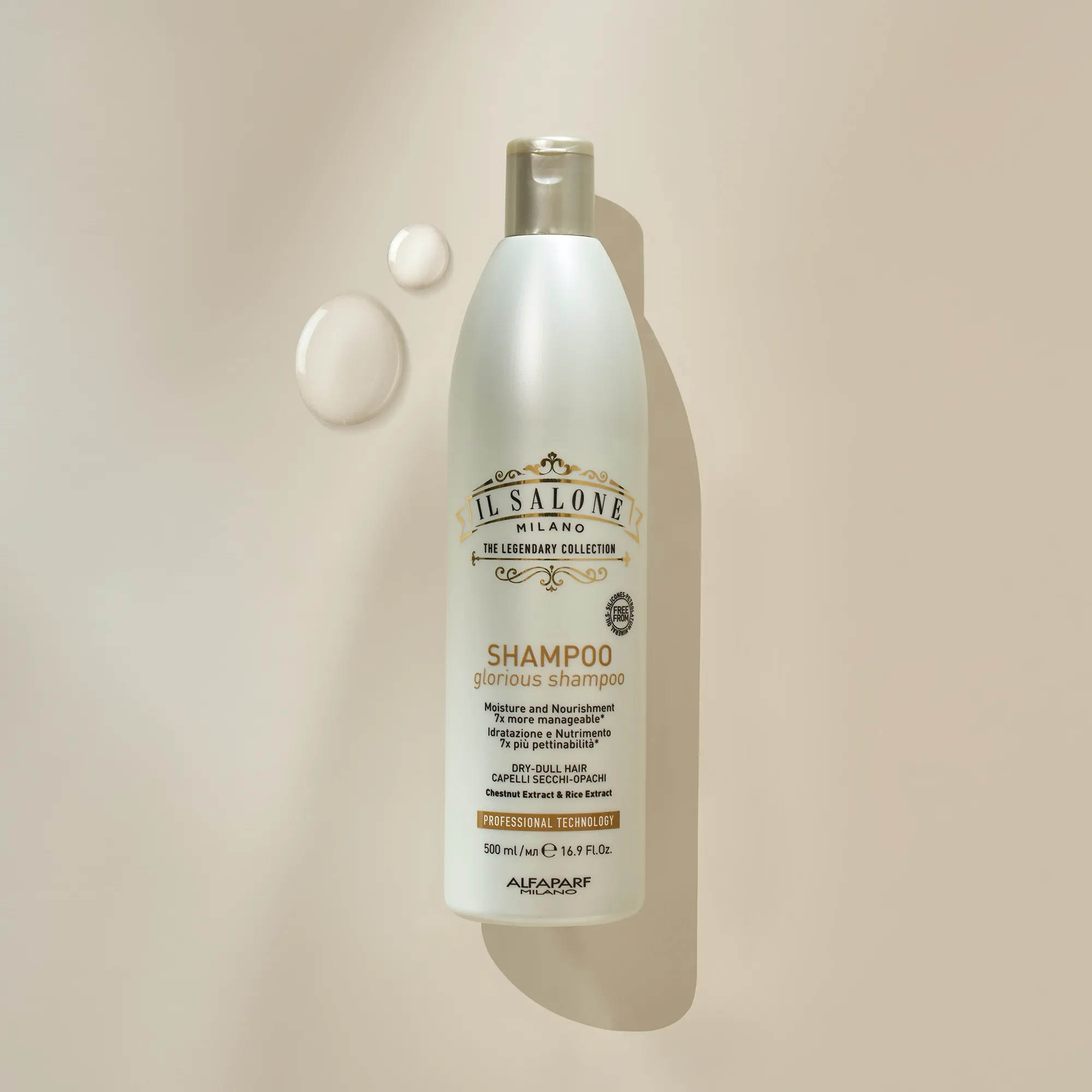 Distribuya sobre el cabello húmedo. Masajee. Aclare. Repetir la operación si es necesario. Continúe con Glorious Conditioner o Glorious Mask.