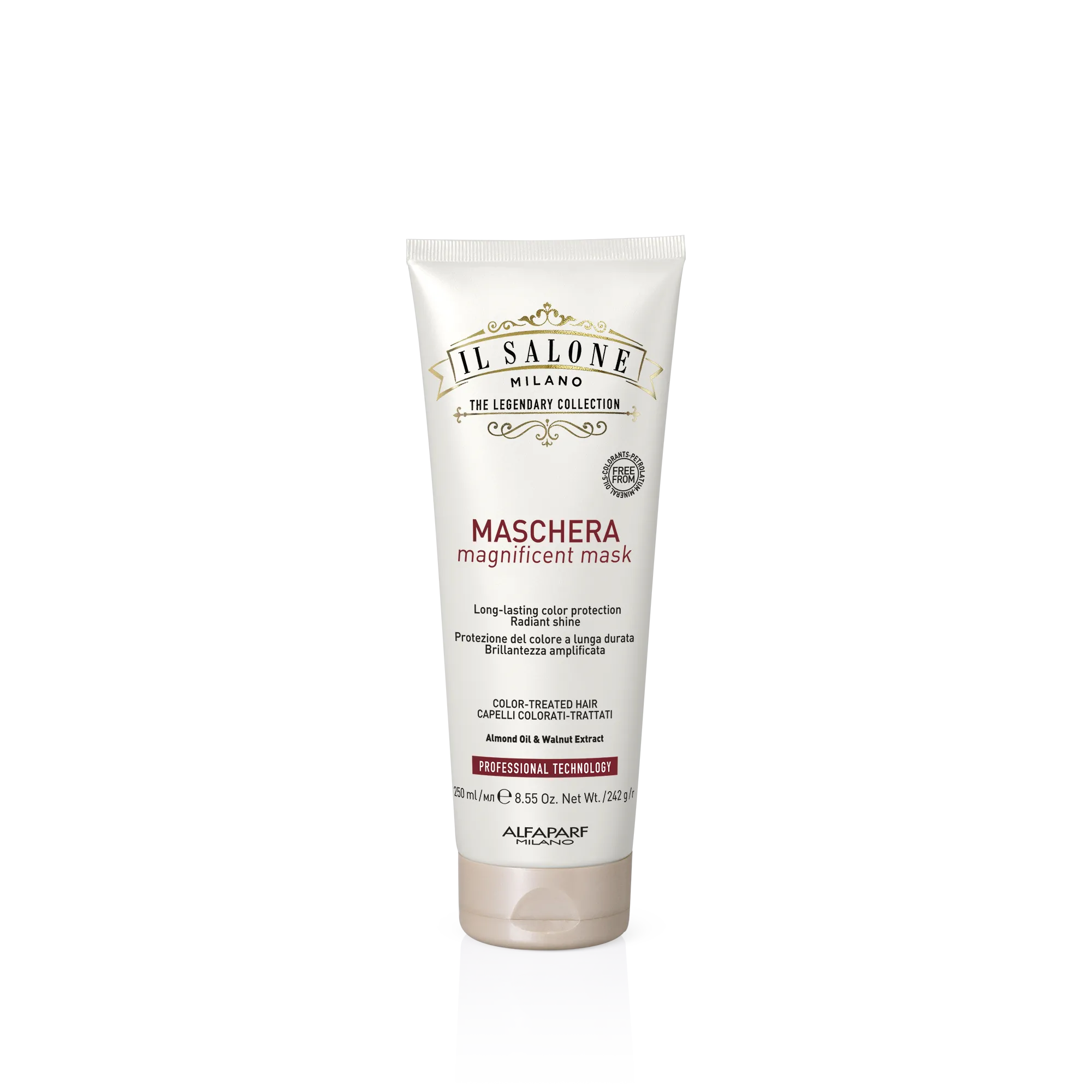 Maschera professionale per capelli colorati-trattati. Trattamento intensivo per amplificare la brillantezza dei riflessi mantenendo inalterato il 95% del colore dopo 25 lavaggi*, per capelli brillanti e setosi al tatto. Usato dai parrucchieri.