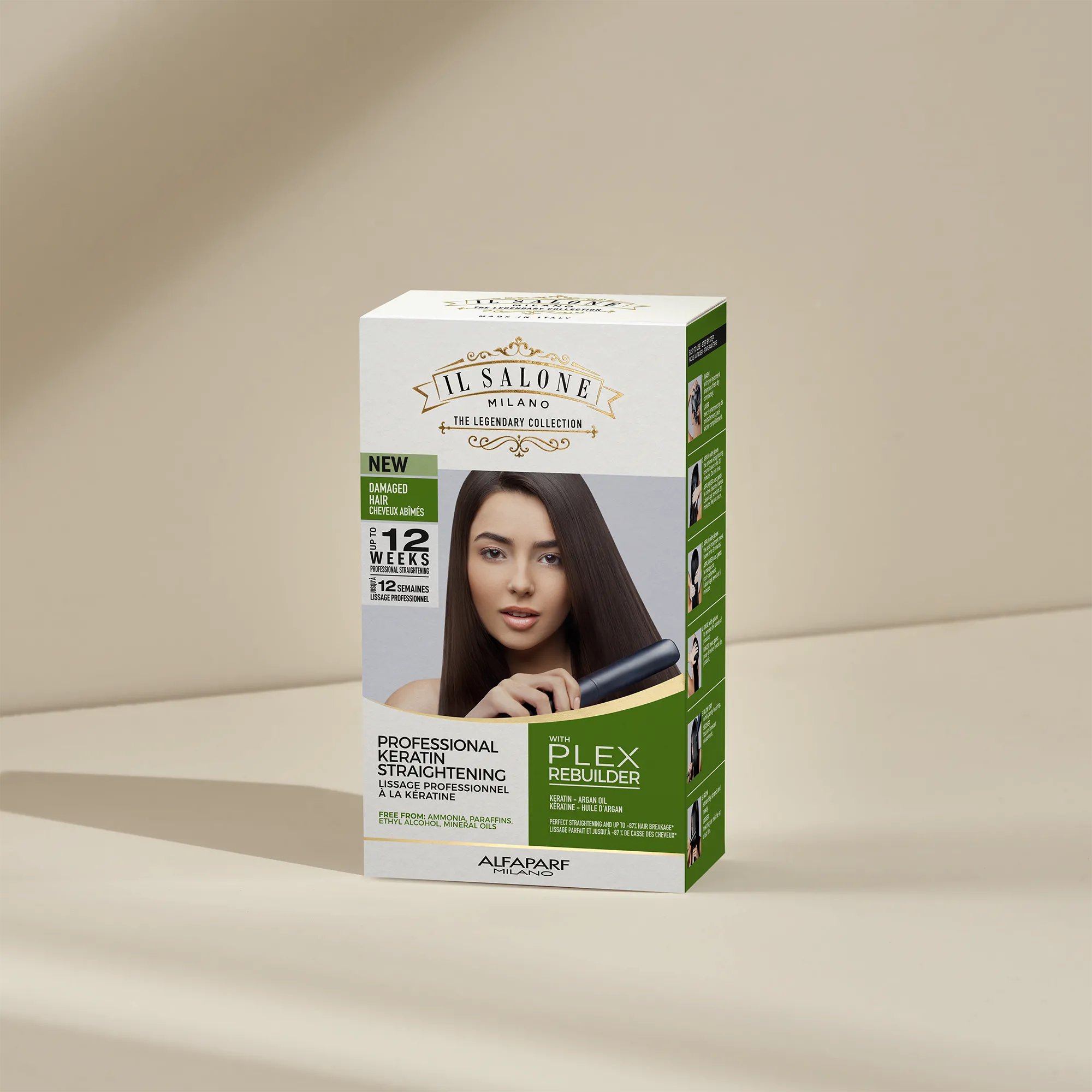 Tratamento de alisamento profissional com queratina do Il Salone Milano para cabelos danificados.